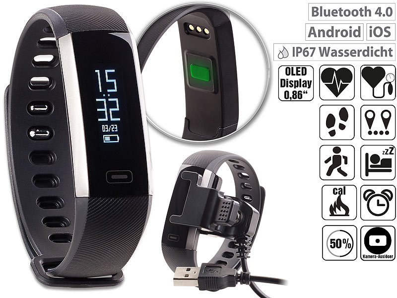 - Fitness-Armband inklusive USB-Ladeclip und deutscher Anleitung