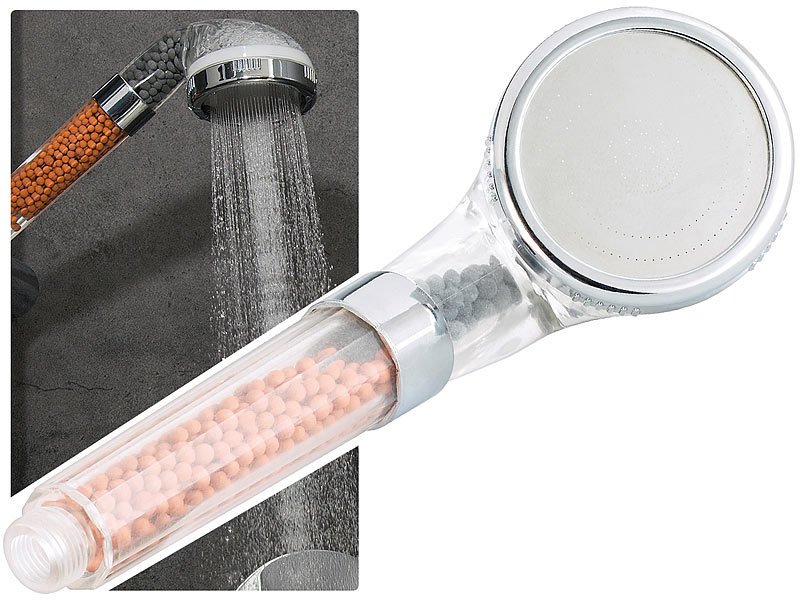 Für Ihre belebende Dusche am Morgen: Mineralsteine und Aktivkohle in diesem Duschkopf wirken als Filter. Das kann die Qualität des Wassers verbessern und seine pflegende Wirkung verstärken.Der Duschkopf ist mit ausgewählten Mineralien gefüllt. Bevor das Wasser Ihre Haut berührt, wird es zuerst durch die Steine geleitet: Aktivkohle kann Chlor, Ozon und Bakterien aus dem Wasser filtern, Zeolith kann Schwermetalle entfernen und den PH-Wert verbessern. Maifan kann das Wasser mit Spurenelementen anreichern.